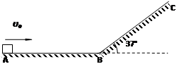 4、计算题  如图所示,一块物块放在固定木板ABC上的A处,其中AB和BC的长度均为lm, BC与水平面间的夹角为37°,物块与木板间的动摩擦因数为0.5。现给物块一个水平向右、大小为4m/s的初速度,不计物块经过B处转向时的机械能损失。求:(sin37°=0.6,cos37°=0.8,重力加速度g取10m/s2)