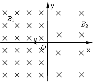 4、计算题 如图所示,在x<0与x>0的区域中,存在磁感应强度大小分别为B1与B2的匀强磁场,磁场方向垂直于纸面向里,且B1>B2。一个带负电的粒子从坐标原点O以速度v沿x轴负方向射出,要使该粒子经过一段时间后又经过O点,B1与B2的比值应满足什么条件?
