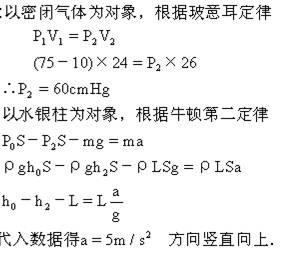 3、简答题  一端封闭粗细均匀的玻璃管内有10cm长的一段水银柱封住一定量的空气.当玻璃管开口向下竖直静止放置时,被封闭的气柱长为24cm,当玻璃管在竖直方向上加速运动时,被封闭的气柱长为26cm.外界大气压强为75cmHg,求玻璃管的加速度大小及方向.(g=10m/