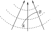 5、选择题  如图所示,带箭头的直线表示某电场的电场线,虚线表示等势线,一个带负电的粒子以一定初速度进入电场,由A运动到B(轨迹为图中AB实曲线所示).设粒子经过A、B两点时的加速度和速度分别用aA、aB、vA、vB表示,则(不计粒子重力)(    )