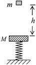 3、计算题 如图所示,质量为M=0.4kg的铁板固定在一根轻弹簧上方,铁板的上表面保持水平。弹簧的下端固定在水平面上,系统处于静止状态.在铁板中心的正上方有一个质量为m="0.1" kg的木块,从离铁板上表面高h=0.8m处自由下落.木块碰到铁板后与铁板一起向下运动,共同下降了l1="0.02" m时,它们的共同速度第一次达到最