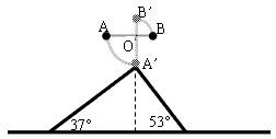 1、计算题 如图,轻直杆AB长为2m,两端各连着一个质量为1kg的小球,直杆绕着O点以ω=8rad/s逆时针匀速转动,AO=1.5m,A轨迹的最低点时恰好与一个直角斜面体的顶点相切,斜面的底角为37°和53°,取g=10m/s2。