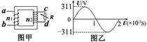 3、选择题 如右图甲所示,在闭合的铁芯上绕着两个线圈,两个线圈的匝数比n1∶n2=1∶3。a、b两端加上如右图乙所示的交流电;c、d两端接一个可变电阻R。下列说法正确的是?(?)