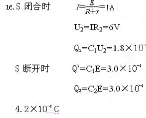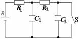 2、计算题 如图所示,E=10V,C1=C2=30μF,R1=4.0Ω,R2=6.0Ω,电池内阻忽略不计。先闭合开关S,待电路稳定后,再将开关断开,则断开S后流过R1的电量为多大?