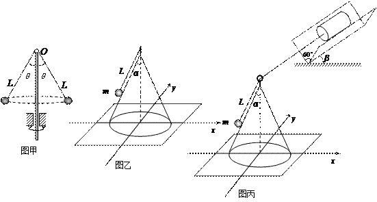 3、简答题 如图甲所示,将质量为m的两个小球(可看成质点),用长为L的两根细软线拴连,线的上端连于O点且绕O点自由转动时与竖直方向夹角为θ。
