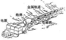 3、选择题 如图所示,电磁炮是由电源、金属轨道、炮弹和电磁铁组成。当电源接通后,磁场对流过炮弹的电流产生力的作用,使炮弹获得极大的发射速度。下列各俯视图中正确表示磁场B方向的是