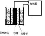 4、选择题 1999年7月12日日本原子能公司所属的敦贺湾核电站由于水管破裂导致高辐射冷却剂外泄,在检测此次事故中,应用于把非电流变化(冷却剂外泄使管中液面变化)转化为电信号的自动化测量技术。如图所示是一种通过检测电容的变化来检测液面高低的仪器原理图,容器中装有导电液体,是电容器的一个电极,中间的芯柱是电容器的另一个电极,芯柱外面套有绝缘管(塑料或橡皮)作为电介质,电容器的两个电极分别用导线接在指示器上,指示器上显示的是电容的大小,从电容的大小就可知容器中液面位置的高低,对此,以下说法正确的是