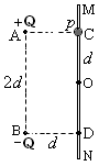 3、计算题 如图所示,固定于同一条竖直线上的A、B是两个带等量异种电荷的点电荷,电荷量分别为+Q和-Q,A、B相距为2d。MN是竖直放置的光滑绝缘细杆,另有一个穿过细杆的带电小球p,其质量为m、电荷量为+q(可视为点电荷,不影响电场的分布),现将小球p从与点电荷A等高的C处由静止开始释放,小球p向下运动到距C点距离为d的O点时,速度为v,已知MN与AB之间的距离为d,静电力常量为k,重力加速度为g。求: