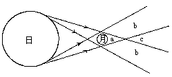 如图所示,当月球运行到太阳与地球之间时,做出太阳发出的光被月球挡住的光路图.处在月球的本影区a处的地球表面上的人看不见太阳的任何光线,因此处在这个区域的人可以看见日全食;处在月球半影区b处的地球表面上的人只能看见太阳上部或下部发出的光,因此处在这个区域的人可以看见日偏食;处在月球半影区c处的地球表面上的人能看到太阳的边缘发出的光,却无法看到太阳中心发出的光线,因此处在这个区域的人可以看见日环食.