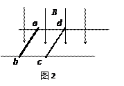2、简答题  如图2所示,水平面上固定有平行导轨,磁感应强度为B的匀强磁场方向竖直向下。同种合金做的导体棒abcd横截面积之比为2∶1,长度和导轨的宽均为Lab的质量为m,电阻为r,开始时abcd都垂直于导轨静止,不计摩擦。现在给ab一个向右的瞬时速度v,在以后的运动中,求cd的最大加速度am是多少?