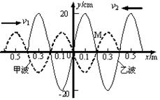 2、选择题 如图所示为两列简谐横波在同一绳上传播时某时刻的波形图,虚线波速度v1向右,实线波速度v2向左,质点M的平衡位置为x = 0.2m。则下列说法中正确的是 (?)