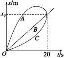 5、选择题 若有A、B、C三辆汽车同时同地出发沿笔直公路行驶,它们运动的情况在x-t图象中如右图所示,则在20 s内,它们的平均速度关系为(?)