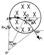2、计算题 如图所示,分布在半径为r的圆形区域内的匀强磁场,磁感应强度为B,方向垂直于纸面向里。已知带电量为q(粒子带负电)、质量为m的粒子从磁场的边缘A点沿圆的半径AO方向射入磁场,穿过磁场区域后,速度方向偏转了60°角。(不计该粒子的重力)