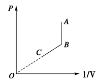 5、选择题 如图所示,为一定质量的理想气体的p-1/V图象,图中BC为过原点的直线,A、B、C为气体的三个状态,则下列说法中正确的是( )