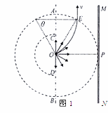 (2)从AB圆弧面收集到的粒子有2/3能打到MN板上,刚好不能打到MN上的粒子从磁场中出来后速度方向与MN平行,则入射的方向与AB之间的夹角是60°,在磁场中运动的轨迹如图1,轨迹圆心角θ=60°(2分)