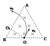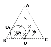 本题解析:(1)粒子仅在洛仑兹力作用下在磁场内做匀速圆周运动,如刚好垂直AB边飞出,其运动轨迹如图所示,其中O1为圆心位置,O1O为半径R.洛仑兹力充当向心力,