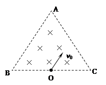1、计算题 (10分)在边长为a的等边三角形ABC区域内有一匀强磁场,磁感应强度为B,方向垂直纸面向里,一带正电的粒子质量为m,电量为q,由BC边中点O沿平行于AB的方向射入磁场,速度大小为v0,忽略粒子的重力.