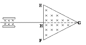 4、计算题 图中左边有一对平行金属板,两板相距为d,电压为u,两板之间有匀强磁场,磁场应强度大小为B0,方向平行于板面并垂直于纸面朝里。图中右边有一边长为a的正三角形区域EFG(EF边与金属板垂直),在此区域内及其边界上也有匀强磁场,磁感应强度大小为B,方向垂直于纸面朝里。假设一系列电荷量为q的正离子沿平行于金属板面,垂直于磁场的方向射入金属板之间,沿同一方向射出金属板之间的区域,并经EF边中点H射入磁场区域。不计重力