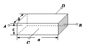 4、选择题 如图所示,长方体铜柱长a=10cm,宽b=5cm,高c=3cm,当将A与B接入电压为U的电路中时,电流强度为1 A,若将C与D接入电压为U的电路中,则电流为