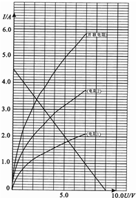 1、填空题 有两个电阻1和2,它们的阻值随所加电压的变化而改变,从而它们的伏安特性即电压和电流不再成正比关系(这种电阻称为非线性电阻).假设电阻1和电阻2的伏安特性图线分别如图所示.现先将这两个电阻并联,然后接在电动势E=9.0V、内电阻r0=2.0Ω的电源上.试利用题给的数据和图线在题图中用作图法读得所需的数据,进而分别求出电阻1和电阻2上消耗的功率P1和P2.要求:
