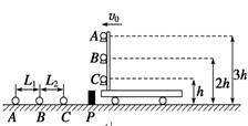 1、选择题 在水平路面上做匀速直线运动的小车上有一固定的竖直杆,其上的三个水平支架上有三个完全相同的小球A、B、C,它们离地的高度分别为3h、2h和h,当小车遇到障碍物P时,立即停下来,三个小球同时从支架上水平抛出,先后落到水平路面上,如题图所示.则下列说法正确的是