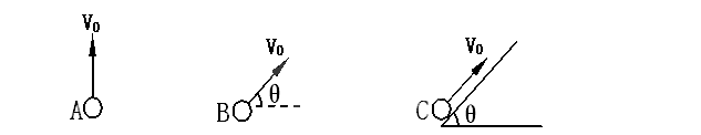 1、选择题 质量和初速度大小v0都相等的A、B、C三个小球,在同一水平面上A球竖直上抛,B球以倾角θ斜向上抛,C球沿倾角也为θ的光滑斜面上滑,(空气阻力不计),它们上升的最大高度分别为hA、hB、hC,则( )
