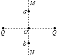 3、选择题 两个带电量均为Q的正电荷,固定于两点,它们连线的垂直平分线MN交其连线于O点,如图所示,现在MN上取a、b两点,且aO=Ob,将电荷q从a移至b的过程中