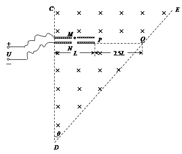 5、计算题 如图所示,两块平行板电极的长度为L,两板间距离远小于L,可忽略不计。两板的正中央各有一个小孔M、N,两孔连线与板垂直。现将两极板分别接在可调直流电压U的两端,极板处在一有界匀强磁场(板内无磁场),磁感应强度为B,磁场的两条边界CD、DE的夹角θ=60°。下极板延长线与边界DE交于Q点,极板最右端P与Q间距离为2.5L。现将比荷均为