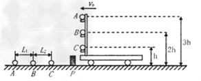 5、选择题 在水平路面上做匀速直线运动的小车上有一同定的竖直杆,其上的二个水平支架上有二个完全相同的小球A、B、C,它们离地的高度分别为3h、2h和h,当小车遇到陆碍物P时,立即停下来,二个小球同时从支架上水平抛出,先后落到水平路面上,如图所示。则下列说法正确的是