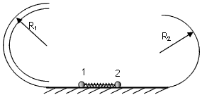 4、计算题 如图所示,质点小球1、2的质量分别为m1=1kg与m2=2kg,用细线固定置于光滑水平面上,中间轻质弹簧处于压缩状态,弹性势能为Ep=30J。某时刻绳子断开,小球被弹开,小球1、2得到了相等大小的动量,尔后分别进入竖直光滑圆轨道,且刚好能通过轨道的最高点,(g取10m/s2)求: