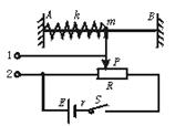 已知滑块质量为m,弹簧劲度系数为k,电源电动势为E,内电阻为r,滑动变阻器总阻值R=4r,有效总长度为L。当待测系统静止时,滑动臂P位于滑动变阻器的中点,且1、2两接线柱输出的电压U0=0.4E。取AB方向为参考正方向。