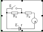 1、简答题 如图所示的电路中,电源的电动势E=10V,R1=R2=6Ω,当电键S断开时,电流表的示数I1=1.25A.求: