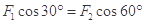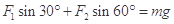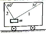 4、计算题 (12分)如图所示,用两细绳系着一质量为的物体,1、2两细绳与水平车顶的夹角分别为