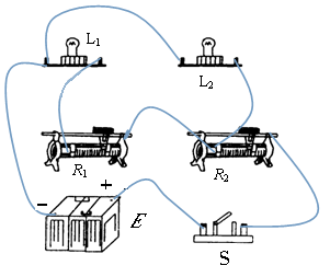 (2)实物图的连接时,先选电源、开关、R2、R1、L1回路,把它们首尾连接好,再把L2并联上去即可,如图所示。