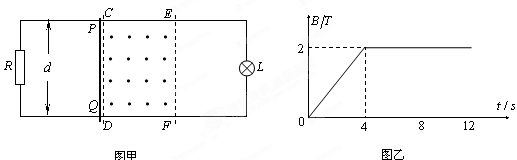 2、计算题 如图甲所示,水平面上的两光滑金属导轨平行固定放置,间距d=0.5 m,电阻不计,左端通过导线与阻值R =2 W的电阻连接,右端通过导线与阻值RL =4 W的小灯泡L连接.在CDEF矩形区域内有竖直向上的匀强磁场,CE长l ="2" m,有一阻值r ="2" W的金属棒PQ放置在靠近磁场边界CD处(恰好不在磁场中).CDEF区域内磁场的磁感应强度B随时间变化如图乙所示.在t=0至t=4s内,金属棒PQ保持静止,在t=4s时使金属棒PQ以某一速度进入磁场区域并保持匀速运动.已知从t=0开始到金属棒运动到磁场边界EF处的整个过程中,小灯泡的亮度没有发生变化,求: