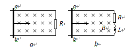 4、选择题 右图中(a)(b)两图为与匀强磁场垂直放置的两个金属框架,(b)图的闭合电路中只比(a)图的闭合电路中多串联了一只电阻不计的自感线圈L,其余完全相同. 若导体ab以相同的加速度从静止开始做匀加速直线运动,则拉它们的外力在相同位移中所做的功(?)