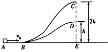 5、计算题  如图,ABC和ABD为两个光滑固定轨道,A、B、E在同一水平面上,C、D、E 在同一竖直线上,D点距水平面的高度为h,C点的高度为2h,一滑块从A点以初速度v0分别沿两轨道滑行到C或D处后水平抛出。