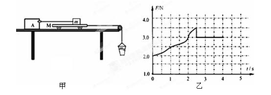 4、选择题 将力传感器A固定在光滑水平桌面上,测力端通过轻质水平细绳与滑块相连,滑块放在较长的小车上(靠右端)。如图甲所示,传感器与计算机相连接,可获得力随时间变化的规律。一水平轻质细绳跨过光滑的定滑轮,一端连接小车,另一端系沙桶,整个装置开始处于静止状态。在物体与小车脱离前缓慢向沙桶里倒入细沙,力传感器采集的F-t图象如乙图所示。则: