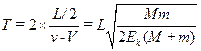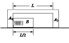 3、简答题 如图所示,滑块A1A2由轻杆连结成一个物体,其质量为M,轻杆长L.滑块B的质量为m,长L/2,其左端为一小槽,槽内装有轻质弹簧.开始时,B紧贴A,使弹簧处在压缩状态.今突然松开弹簧,在弹簧作用下整个系统获得动能Ek,弹簧松开后,便离开小槽并远离物体A1A2.以后B将在A1和A2之间发生无机械能损失的碰撞.假定整个系统都位于光滑的水平面上,求物块B的运动周期.