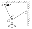1、选择题 如图所示,用一根细线OB把电灯拉至图中位置,电线OA与天花板夹角为60°。若要使细线OB所受拉力最小,则细绳OB与OA的夹角θ应为