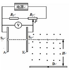 , S1、S2为A、K板上的两个小孔,S1与S2的连线水平,在K板的右侧有一个水平方向的匀强磁场,磁感应强度大小为B="0." 10 T,方向垂直纸面向外.另有一水平放置的足够长的荧光屏D,如图H=0.2m.电量与质量之比为2.0×l05C/kg的带正电粒子由S1进入电场后,通过S2向磁场中心射去,通过磁场后打到荧光屏D上.粒子进入电场的初速度、重力均可忽略不计.