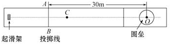 3、计算题 冰壶比赛是在水平冰面上进行的体育项目,比赛场地示意图如图所示.比赛时,运动员从起滑架处推着冰壶出发,在投掷线AB处放手让冰壶以一定的速度滑出,使冰壶的停止位置尽量靠近圆心O.为使冰壶滑行得更远,运动员可以用毛刷擦冰壶运行前方的冰面,使冰壶与冰面间的动摩擦因数减小.设冰壶与冰面间的动摩擦因数为μ1=0.008,用毛刷擦冰面后动摩擦因数减小至μ2=0.004.在某次比赛中,运动员使冰壶C在投掷线中点处以2 m/s的速度沿虚线滑出.求:为使冰壶C能够沿虚线恰好到达圆心O点,运动员用毛刷擦冰面的长度应为多少?(g取10m/s2)