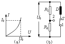 2、选择题 一个用半导体材料制成的电阻器D,其电流I随它两端电压U的关系图象如图(a)所示,将它与两个标准电阻R1、R2并联后接在电压恒为U的电源两端,三个用电器消耗的电功率均为P。现将它们连接成如图(b)所示的电路,接在该电源的两端,设电阻器D和电阻R1、R2消耗的电功率分别是PD、P1、P2,则它们之间的大小关系有