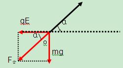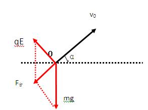 3、计算题 (14分)如图所示,一个质量为m,带电荷量为+q的粒子在O点以v0的初速度跟水平方向成α角向上射出,如果在某方向上加上一定大小的匀强电场后,可使粒子沿初速度所在直线方向做直线运动。已知重力加速度为g.