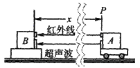 4、计算题 借助运动传感器可用计算机测出物体运动的速度。如图所示,传感器系统由两个小盒子A、B组成,A盒装有红外线发射器和超声波发射器,它装在被测物体上,每隔0.03 s可同时发射一个红外线脉冲和一个超声波脉冲;B盒装有红外线接收器和超声波接收器,B盒收到红外线脉冲时开始计时(红外线的传播时间可以忽略不计),收到超声波脉冲时计时停止。在某次测量中,B盒记录到的连续两次的时间分别为0.15 s和0.20 s,根据你知道的知识,该物体运动的速度为多少?运动方向是背离B盒还是靠近B盒?(声速取340 m/s)