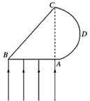 某透明物体的横截面如图所示,其中△ABC为直角三角形,AB为直角边,长度为2L,∠ABC=45°,ADC为一圆弧,其圆心在AC边的中点.此透明物体的折射率为n=2.0。若一束宽度与AB边长度相等的平行光从AB边垂直射入透明物体,试由光路图画出光线从ADC圆弧射出的区域,并求此区域的圆弧长度s。(不考虑经ADC圆弧反射后的光线)