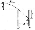 ="4" m/s的初速度水平抛出(A点距两板上端的高度为h="0.2" m),之后小球恰好从靠近M板上端处进入两板间,沿直线运动碰到N板上与N板上端相距L的B点.不计空气阻力,取