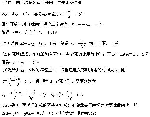 2、简答题 如图所示,电荷量均为+q、质量分别为m和3m的小球A和B,中间连接质量不计的细绳,在竖直向上方向的匀强电场中以速度v0匀速上升.若不计两带电小球间的库仑力作用,某时刻细绳断开,求: