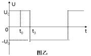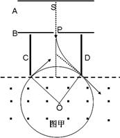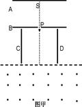 2、计算题 带电粒子在AB两极板间靠近A板中央附近S处静止释放,在两极板电压中加速,从小孔P平行CD极板方向的速度从CD极板中央垂直进入偏转电场,B板靠近CD板的上边缘如图甲.在CD两板间加如图乙所示的交变电压,设时刻粒子刚好进入CD极板,