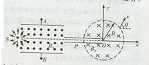 3、计算题 如图所示为一离子选择器,极板A、B间距为d,用来研究粒子的种类及偏向角,在A、B间加电压,B板电势高于A板电势,且A、B极板间有垂直纸面向外的匀强磁场,磁感应强度为Bl,P为一剐性内壁光滑绝缘的两端开口的直细管"右端开口在一半径为R的圆形磁场区域中心O点(即坐标原点),此磁场方向为垂直纸面向里的匀强磁场,磁感应强度为B2。细管的中心轴所在直线通过S粒子源,粒子源可发出电荷量为q、质量为m、速度大小、方向都不同粒子。当有粒子从圆形区域磁场射出时,其速度方向与x轴的夹角为偏向角。不计粒子重力。